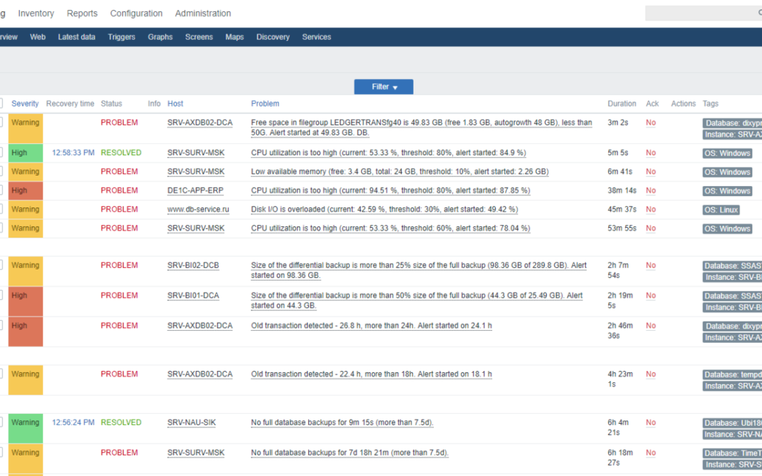 Everything is displayed on 1 dashboard, including data on monitoring of all databases and business processes. If you are not there, the chatbot will inform you about incidents and critical conditions – in instant messengers or by email.